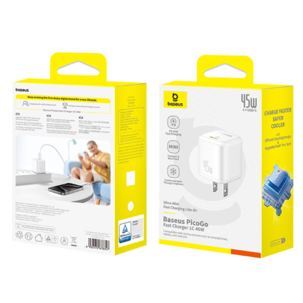 El cargador rápido Baseus PicoGo GaN 1C 45W es la solución ideal para la necesidad de cargar de forma rápida y segura tus dispositivos electrónicos. Con una capacidad de 45 W, este producto carga rápidamente dispositivos como teléfonos inteligentes, tabletas y computadoras portátiles, lo que garantiza que esté siempre listo para cualquier actividad.