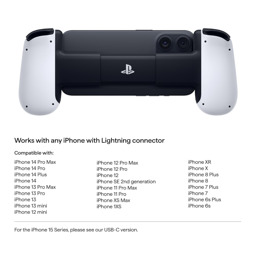 Hecho para Apple Funciona con la mayoría de los dispositivos iPhone (Serie 14 y generaciones anteriores) que tienen un conector Lightning. Para la serie iPhone 15, compra el controlador Backbone One - PlayStation (USB-C)