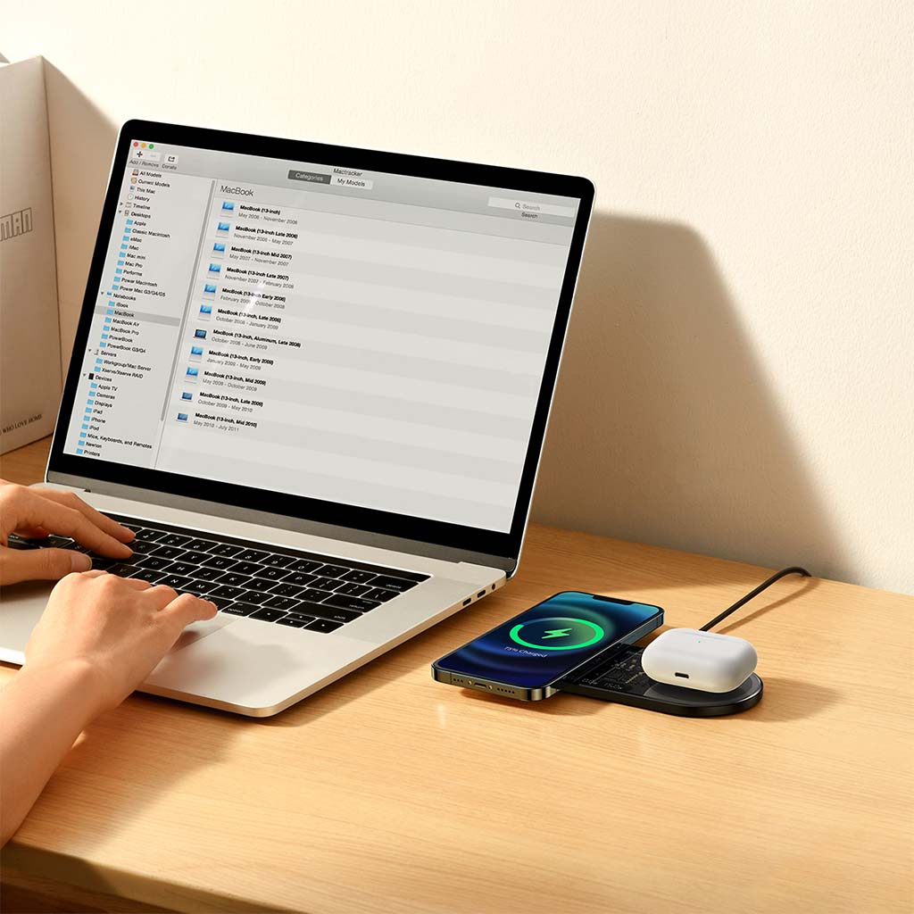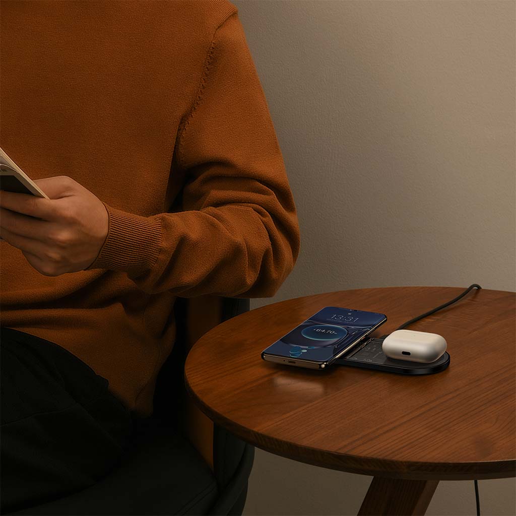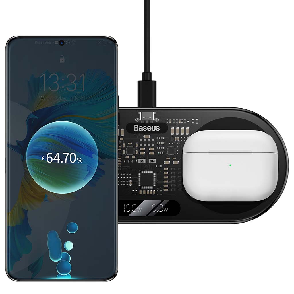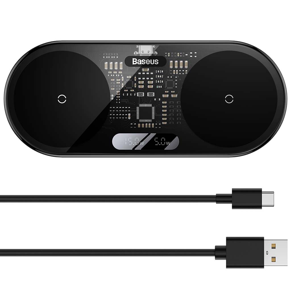 Baseus Digital LED Display Dual Qi Cargador inalámbrico con pantalla digital 20W. Un cargador inalámbrico de tamaño compacto te permitirá controlar el estado de la batería y asegurarte de que tu dispositivo electrónico esté siempre listo para funcionar. El dispositivo 2 en 1 está equipado con dos bobinas de inducción, por lo que su funcionalidad aumenta automáticamente.