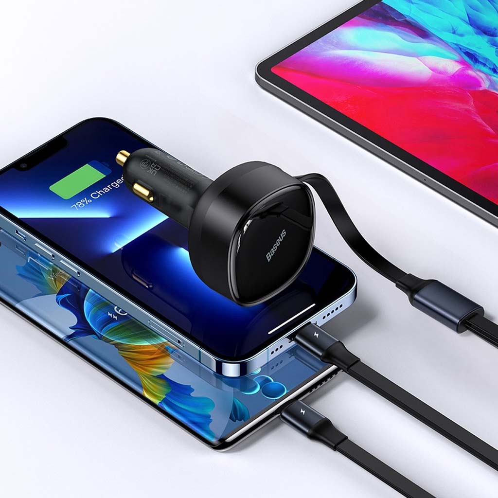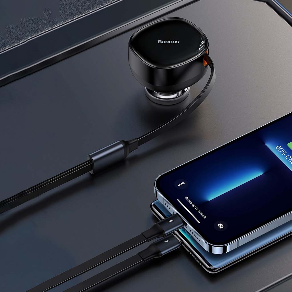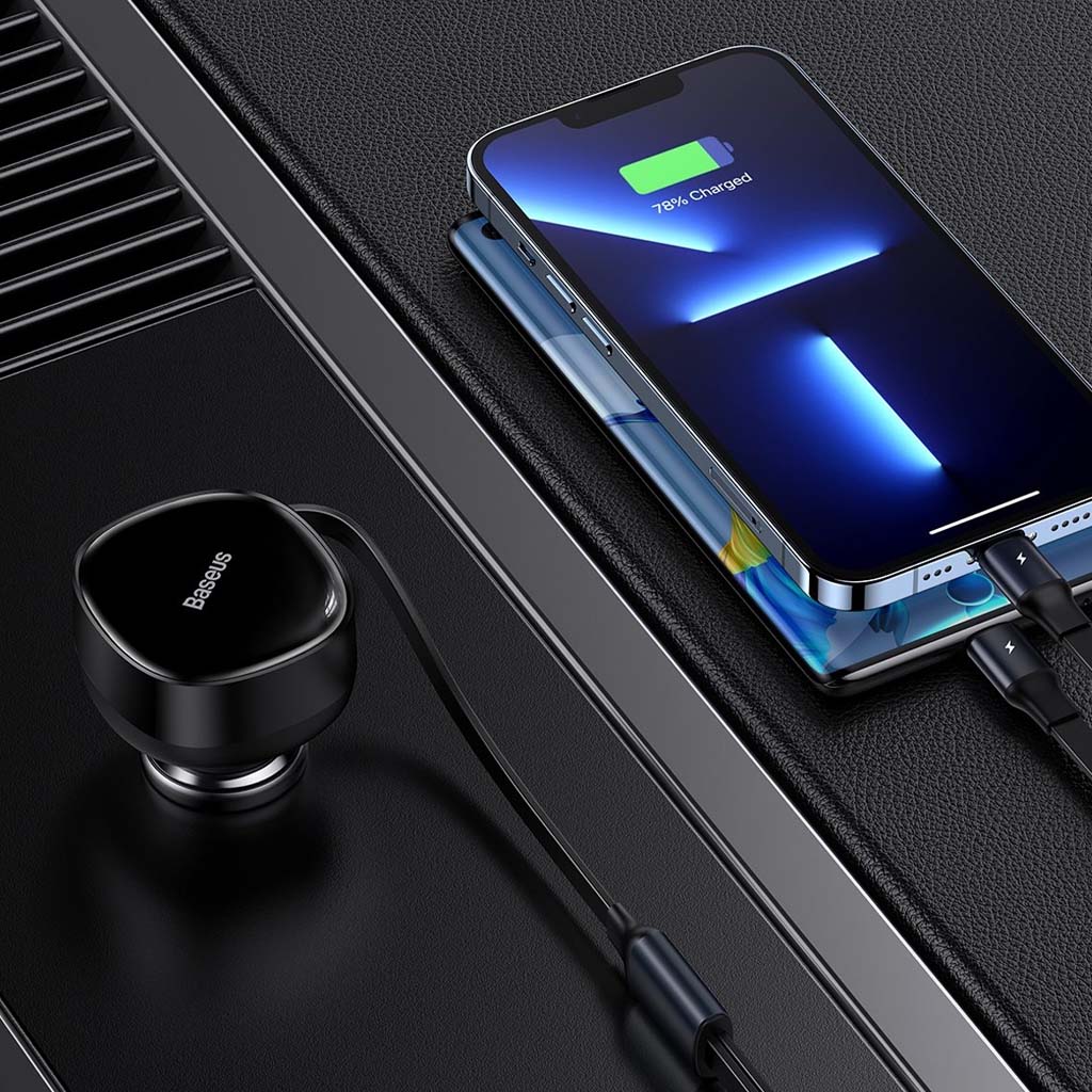 cargador de coche retráctil 2 en 1, carga simultáneamente 2 dispositivos con certificado multiprotocolo, de uso universal para vehículo de 12v-24v