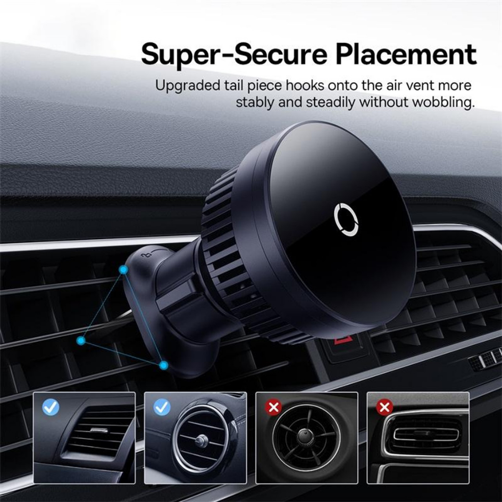 Soporte magnetico de telefono para coche serie Baseus Magpro con carga inalambrica de 15w, seguro y estable para un telefono con carga de hasta 1,2kg. Diseñado para su instalacion en la rejilla de ventilacion. Admite modos horizontal y vertical con diferentes angulos de vision.