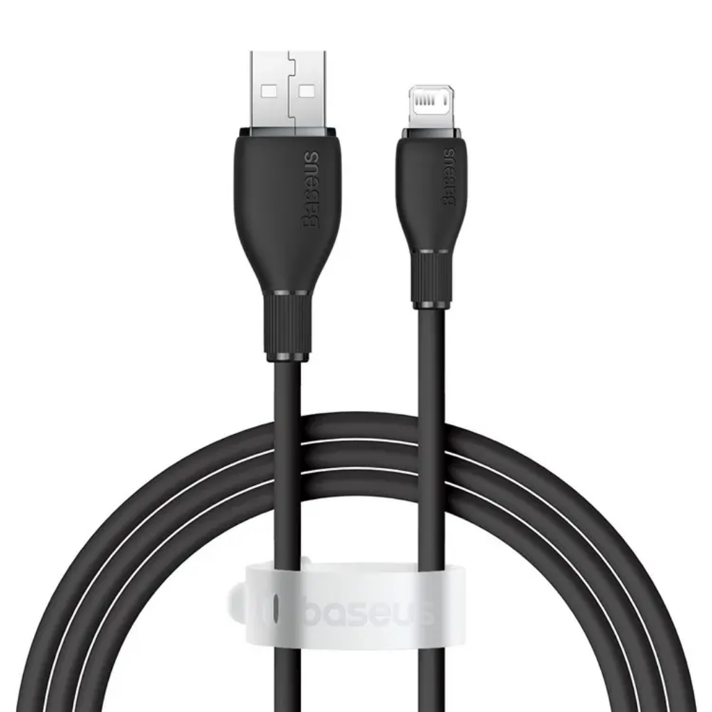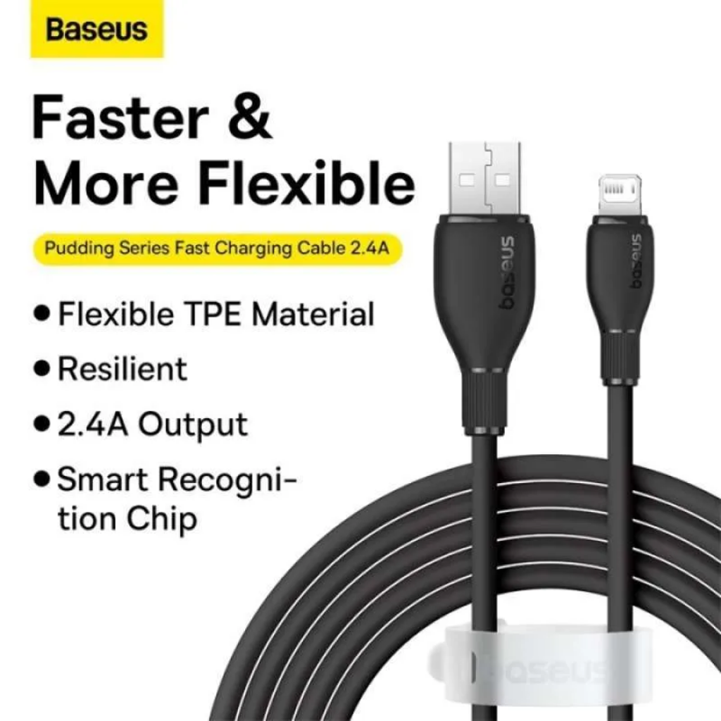 Cable Baseus tipo USB-A a Lightning, salida mas rapida de 2,4 A compatible con disppsitivos Apple. Cuenta con chip inteligente actualizado, mas seguro y rapido con flexibilidad y durabilidad de material TPE suave.