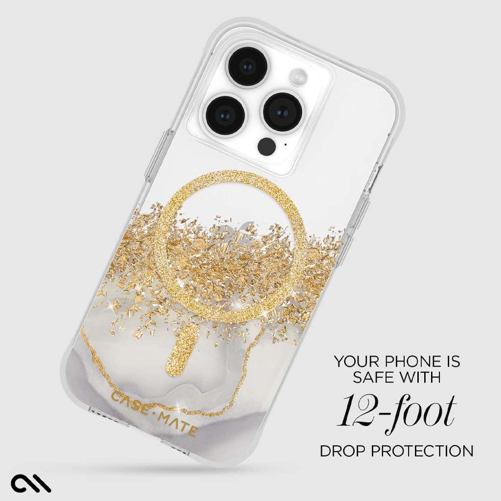 Mantenlo con clase: la funda para teléfono Karat Marble MagSafe para iPhone 15 Pro presenta detalles en mármol blanco y dorado para darle un toque moderno a esta apariencia atemporal. Sabemos cuánto amas tu teléfono, así que siéntete seguro sabiendo que es seguro con protección contra caídas de 12 pies, mientras que los fuertes imanes incorporados permiten cargar y accesorios MagSafe fácilmente.