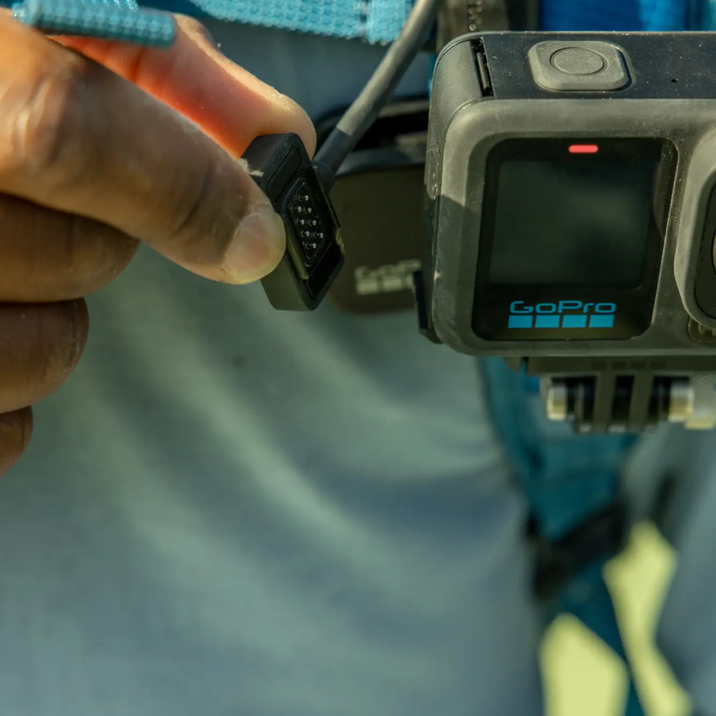 Mantén tu GoPro cargada y maximiza tu tiempo de grabación, incluso cuando estés en medio de la acción, con el kit de cable de alimentación y puerta magnética Contacto. Te permite omitir los cambios de batería mientras estás en la carretera o en un sendero y mantenerte con energía durante actividades, eventos deportivos largos y tomas con lapso de tiempo. Simplemente instala la puerta en tu cámara y conecta el cable de alimentación a la puerta, luego enchúfala a cualquier fuente de alimentación USB-C para cargarla. Tu batería ni siquiera tiene que estar instalada. La puerta también es resistente al agua hasta 33 pies (10 m), por lo que no tienes que volver a instalar tu puerta original cuando grabes bajo el agua.