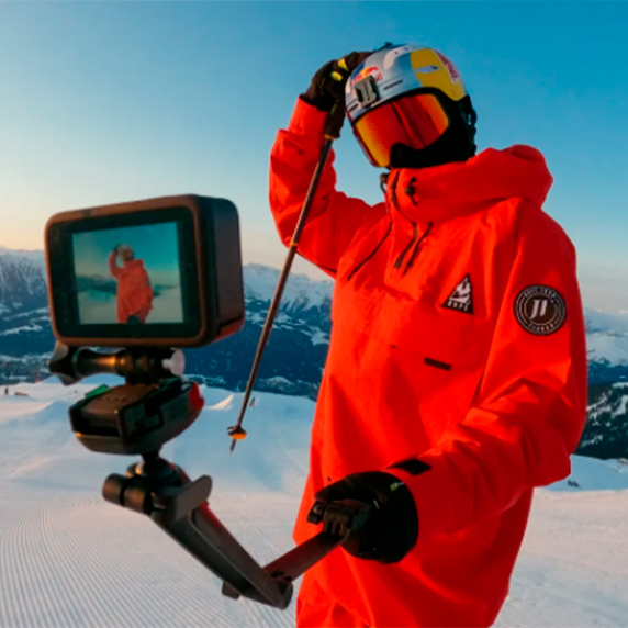 El brazo de extensión plegable actúa como un brazo de mano para selfies, tomas aéreas, secuencias de seguimiento de cámara y acercarse a la acción.