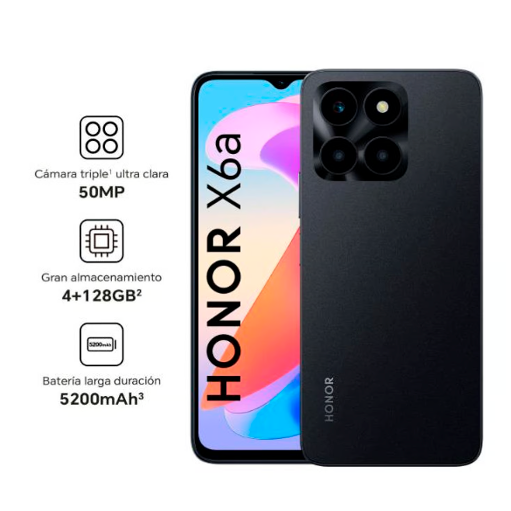 El Honor X6a es una variante del X6 que llega con una pantalla HD+ de 6.56 pulgadas y tasa de refresco de 90Hz. Potenciado por un procesador Helio G36 de MediaTek, el Honor X6a tiene 4GB de RAM con 128GB de almacenamiento, cámara triple de 50MP, cámara frontal de 5MP, una batería de 5200 mAh de capacidad con soporte para carga rápida, lector de huellas y corre Android 13.