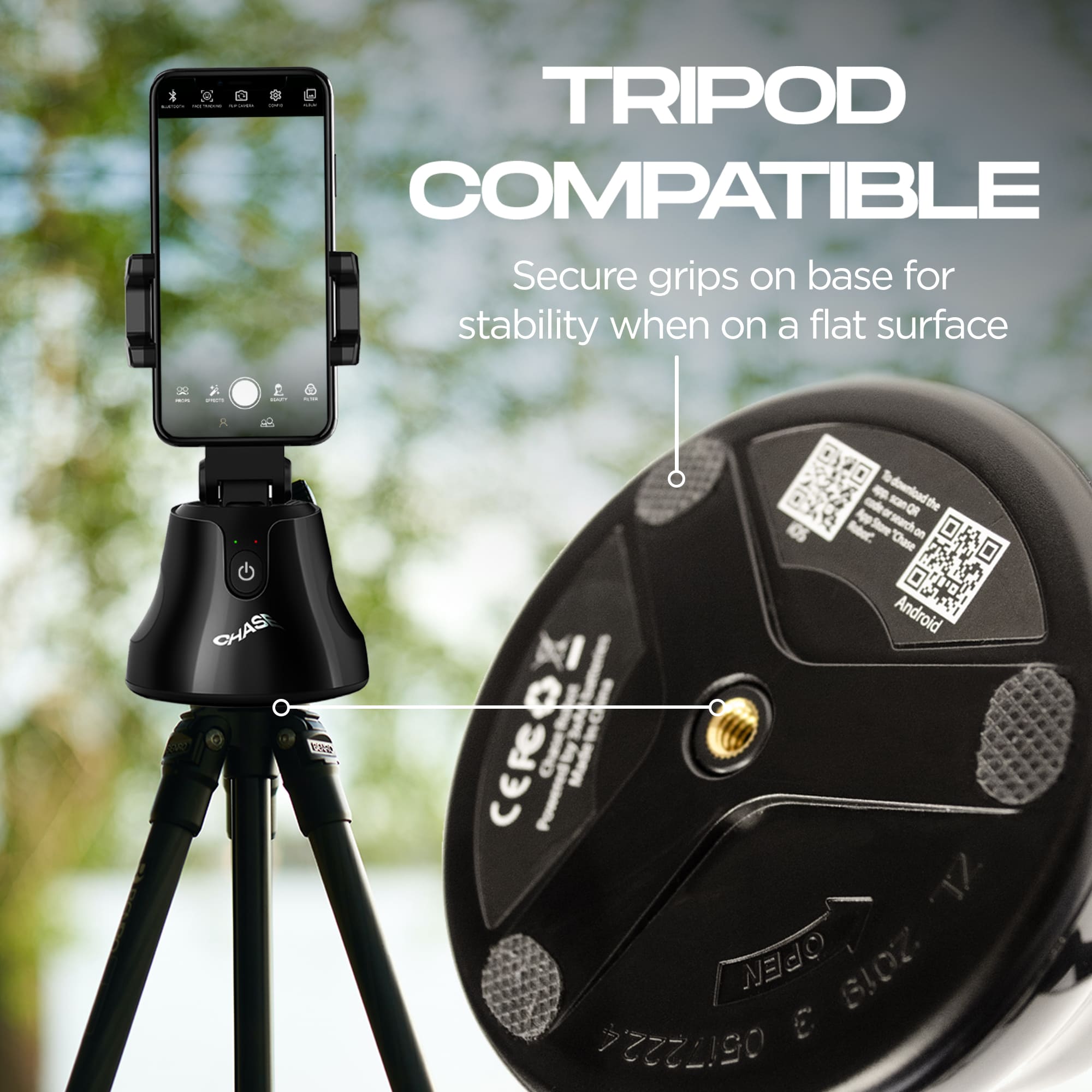 Simplemente conecta el iJoy Chase a tu trípode existente para iPhone, Samsung o más para disfrutar de ambos soportes; conecta tu teléfono celular y graba videos, transmisión en vivo, empareja una luz de anillo con soporte, o disfruta del iJoy por sí solo como un soporte de teléfono para escritorio, un palo selfie para iPhone o palo de transmisión