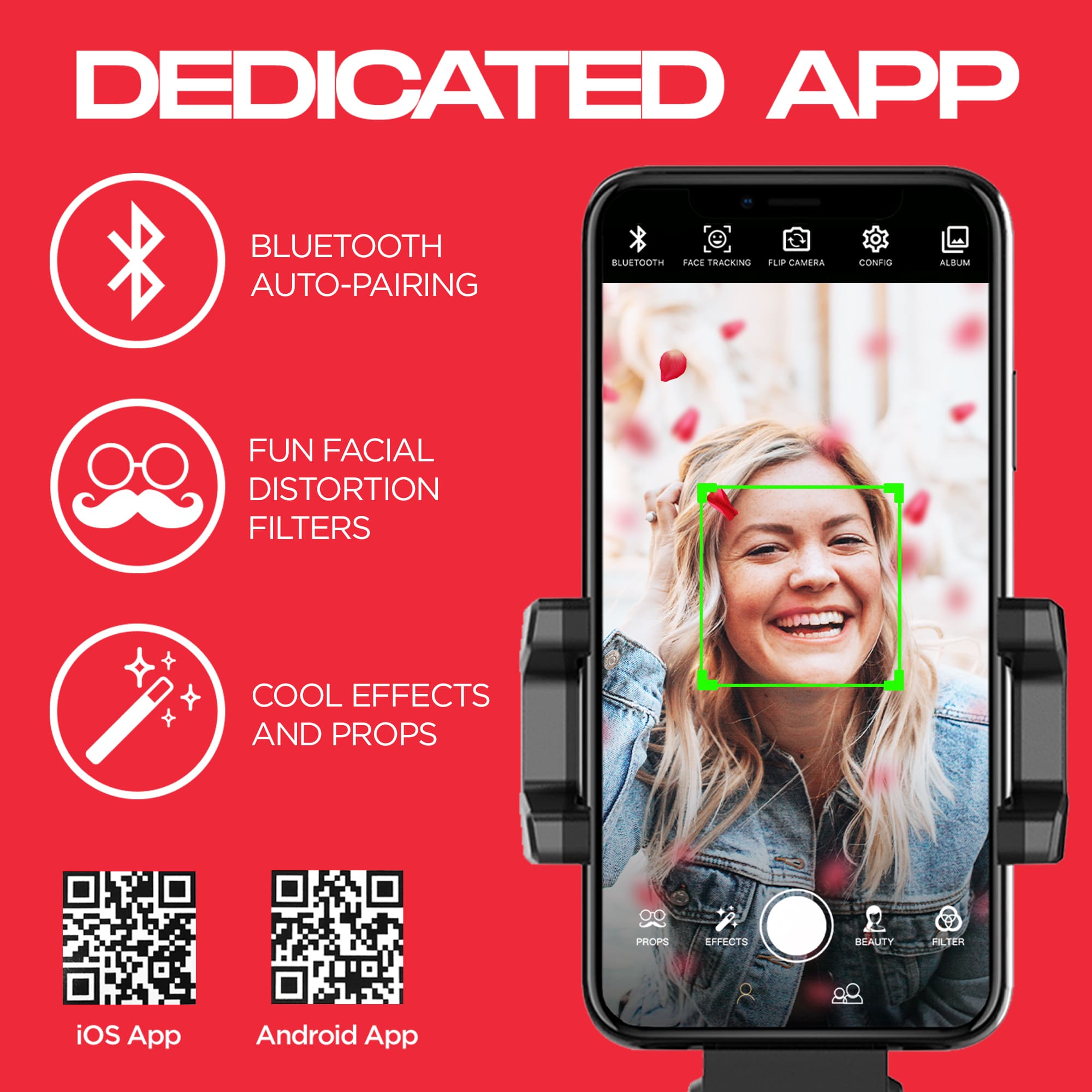 Aplicación integrada: simplemente descarga la aplicación iJoy Chase y empareja con tu teléfono móvil mediante Bluetooth. La innovadora aplicación te permite utilizar el seguimiento de cara/objeto, así como utilizar nuestra gama de filtros y efectos para tomar una foto perfecta o selfie, o crear videos
