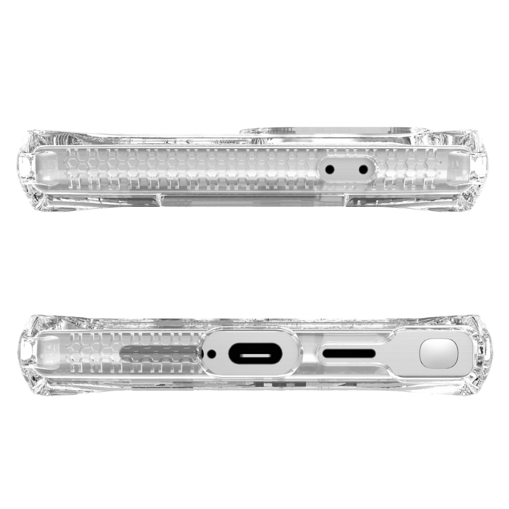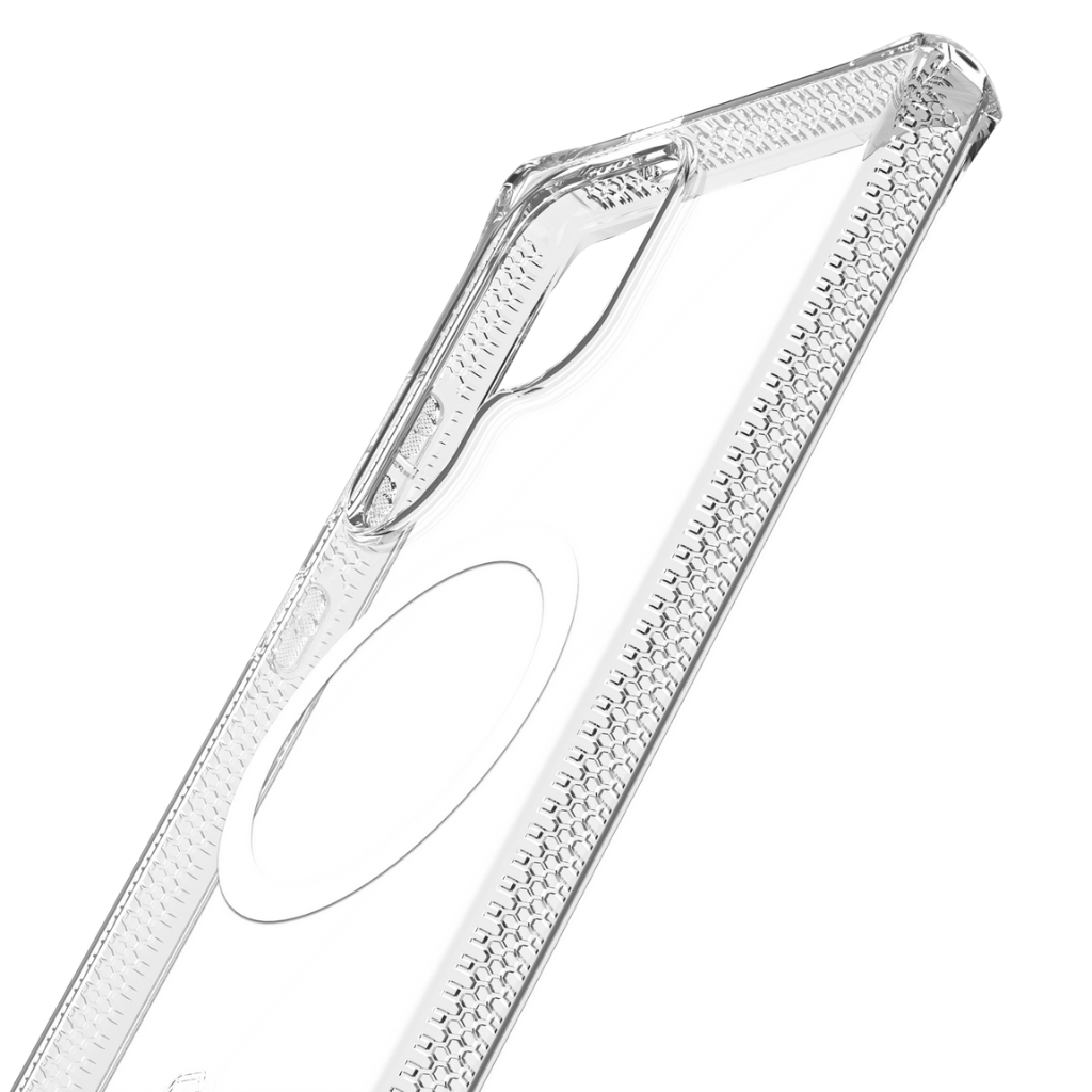HYBRID_R // CLEAR tiene imanes incorporados y está certificado por el Global Recycled Standard por utilizar materiales 100% reciclables y producidos de manera sostenible. Ofrece protección premium contra caídas y defensa antimicrobiana antiamarilleo.