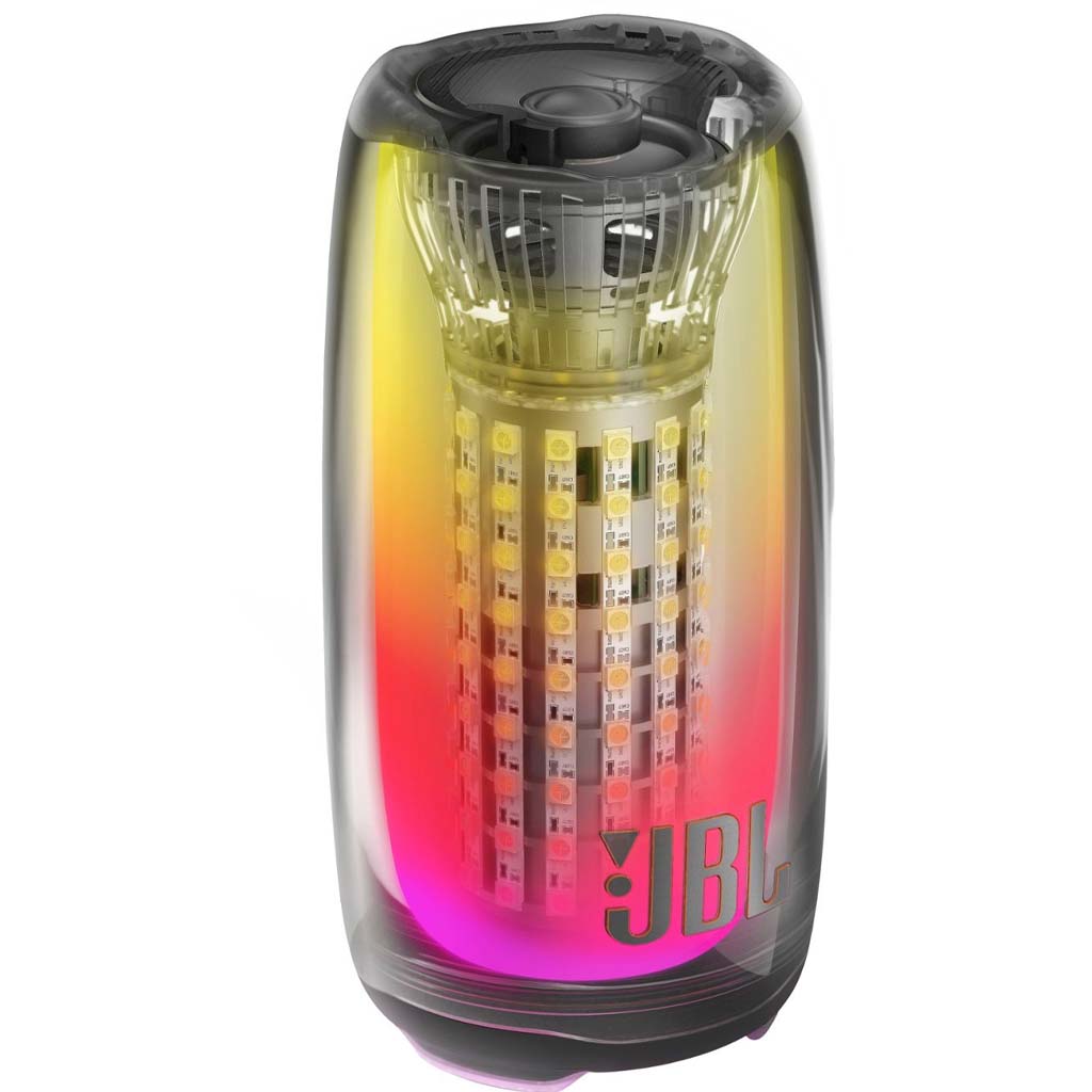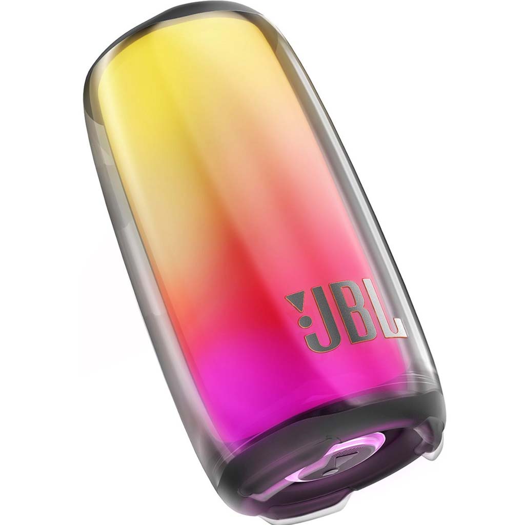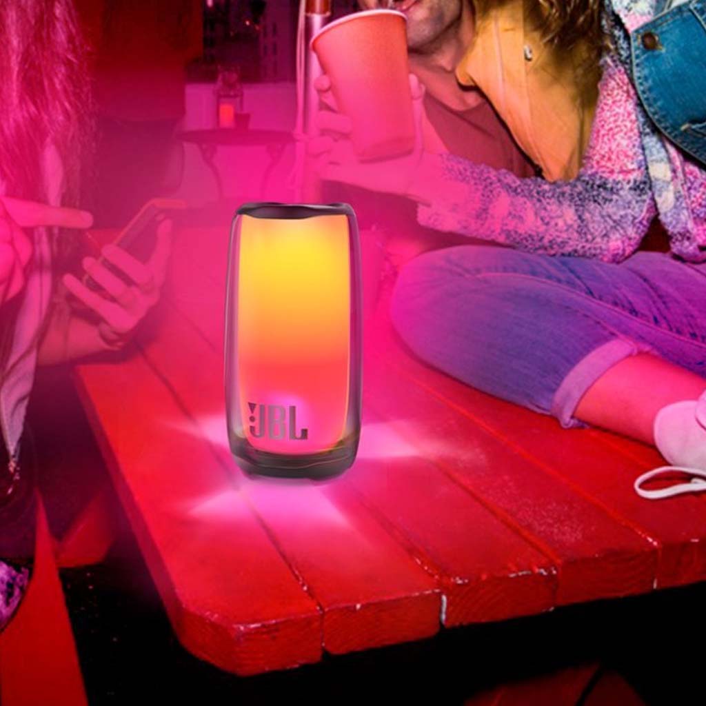 Llamativo juego de luces de 360 grados Ilumina tus noches con 360 grados de colores sincronizados al ritmo de tus canciones favoritas. O puedes adaptarlo a tu estado de ánimo personalizando el juego de luces en el cuerpo exterior transparente del Pulse 5 con la aplicación JBL Portable