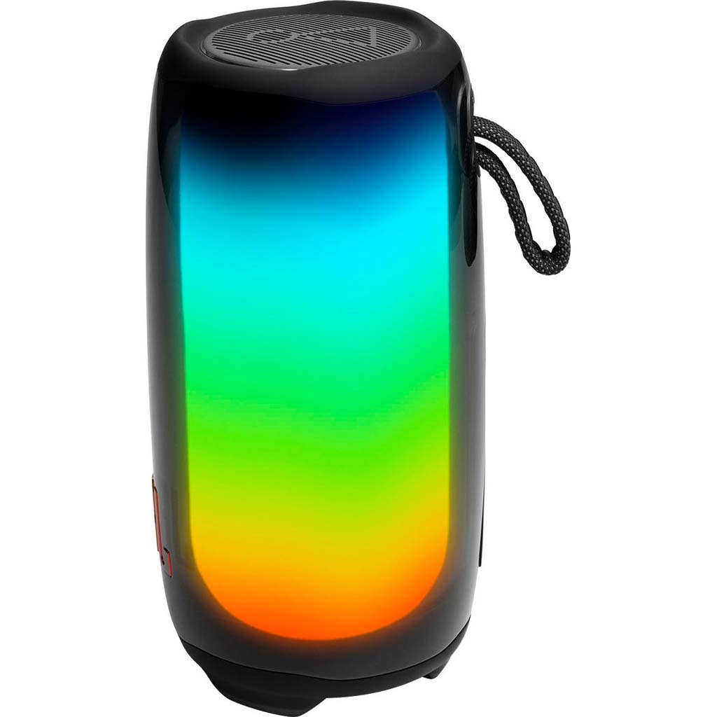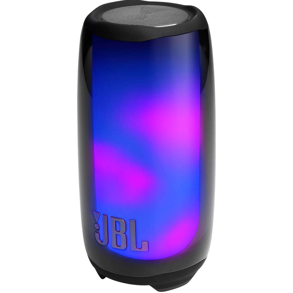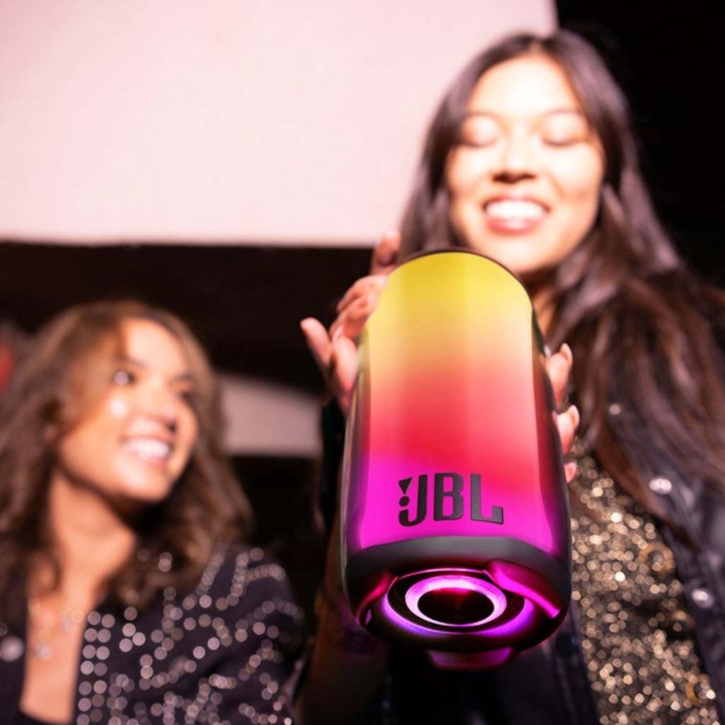 Llamativo juego de luces de 360 grados Ilumina tus noches con 360 grados de colores sincronizados al ritmo de tus canciones favoritas. O puedes adaptarlo a tu estado de ánimo personalizando el juego de luces en el cuerpo exterior transparente del Pulse 5 con la aplicación JBL Portable