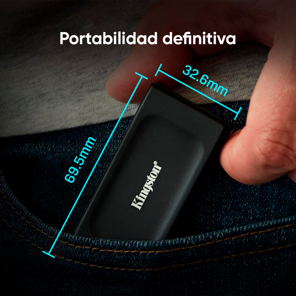 El SSD externo XS1000 de Kingston es una solución para disponer de copias de seguridad de archivos bastante práctica. Por su estilizado y compacto factor de forma, ha sido diseñada para encajar perfectamente en su estilo de vida, permitiéndole llevarla consigo con facilidad. No deje que el tamaño le engañe: esta minúscula y potente unidad alcanza velocidades de hasta 1.050 MB/s1, y capacidades de hasta 2 TB2, ofreciendo suficiente velocidad y espacio para guardar sus valiosos datos. El XS1000, que se conecta mediante USB Tipo-C3 a Tipo-A incluido para ofrecer una comodidad inigualable y una impresionante capacidad de almacenamiento, es la solución más eficiente para realizar copias de seguridad de archivos sin complicaciones. Con el XS1000 siempre podrá acceder a todos los documentos importantes, los recuerdos más preciados y los archivos multimedia. Despídase de la complejidad y dé la bienvenida a lo más avanzado en eficiencias de almacenamiento con el disco SSD externo XS1000.