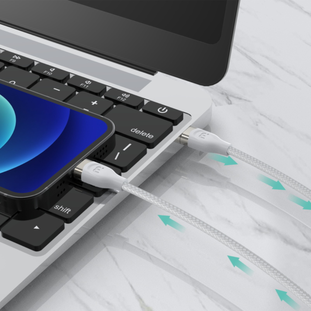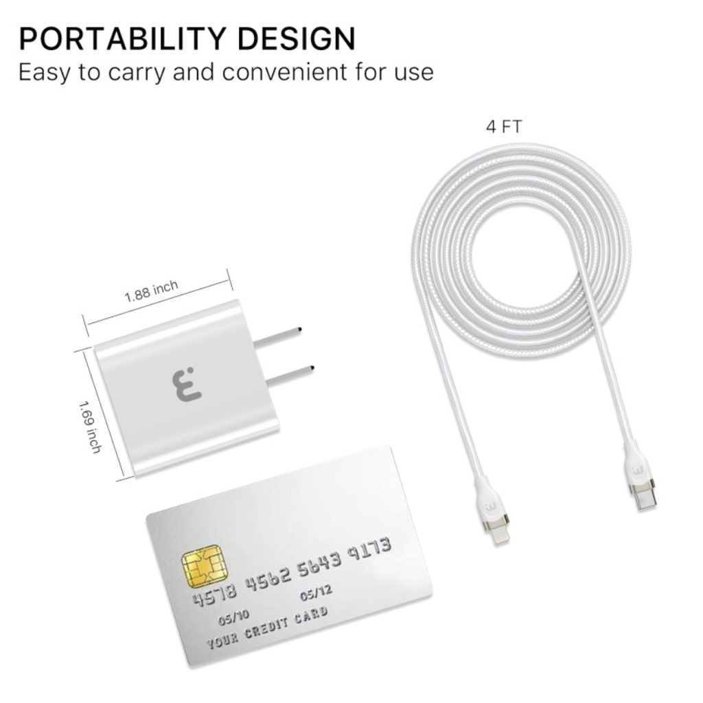 Este práctico cargador de pared, listo para viajar, ofrece hasta 20 W de potencia de carga rápida a los dispositivos de tus clientes, ocupando un espacio mínimo en el enchufe. Tus clientes disfrutarán de una carga increíblemente rápida gracias a su potente puerto USB-C Power Delivery de 20 W. Independientemente de si el dispositivo de tu cliente se carga rápidamente o no, recibirá la máxima potencia posible. El cargador admite el smartphone o la tableta de tus clientes, carga 4 veces más rápido que los cargadores estándar y carga de 0 a 50 % en solo 30 minutos. El cable de carga Lightning a USB-C con certificación MFi es compatible con todos los dispositivos Lightning y cumple con los altos estándares de rendimiento de Apple. Fabricado con nailon trenzado duradero y flexible, este cable ofrece una increíble resistencia a las flexiones, superando a un cable promedio.