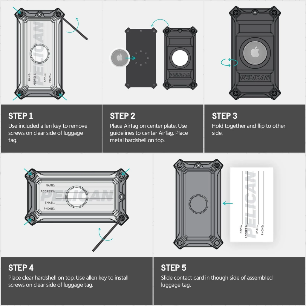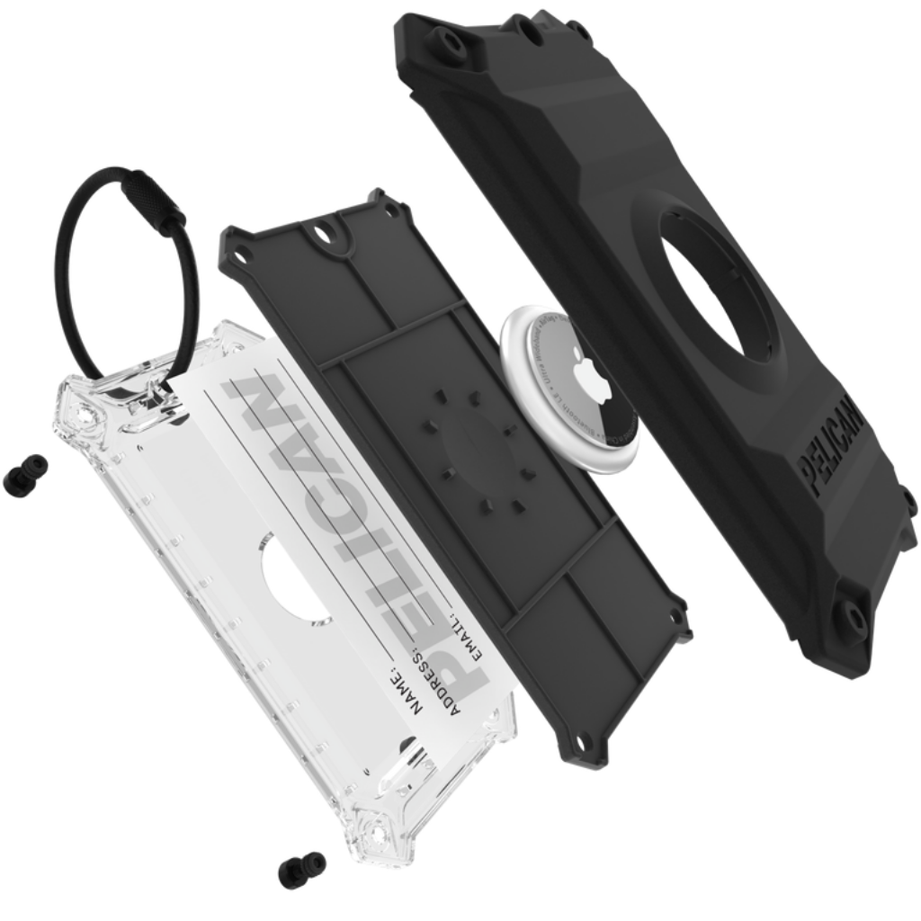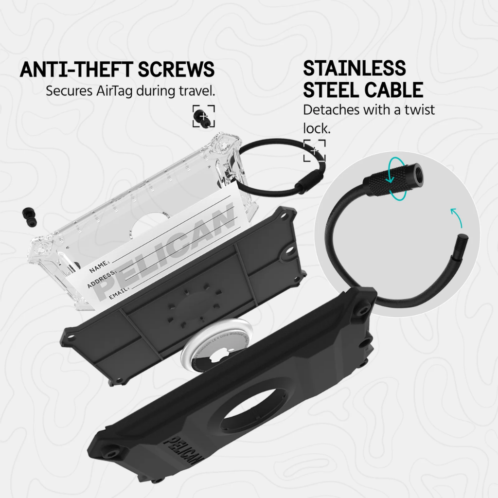 Etiqueta protectora para equipaje Pelican™ Realice un seguimiento de su equipaje y equipo con la resistente etiqueta de equipaje Pelican Protector. La etiqueta de equipaje contiene una etiqueta de aire y una tarjeta de identificación en un diseño protector de dos piezas reforzado con placa de acero resistente a los arañazos. La etiqueta de equipaje se abre y cierra con tornillos reales para insertar un Apple AirTag y una tarjeta de presentación.