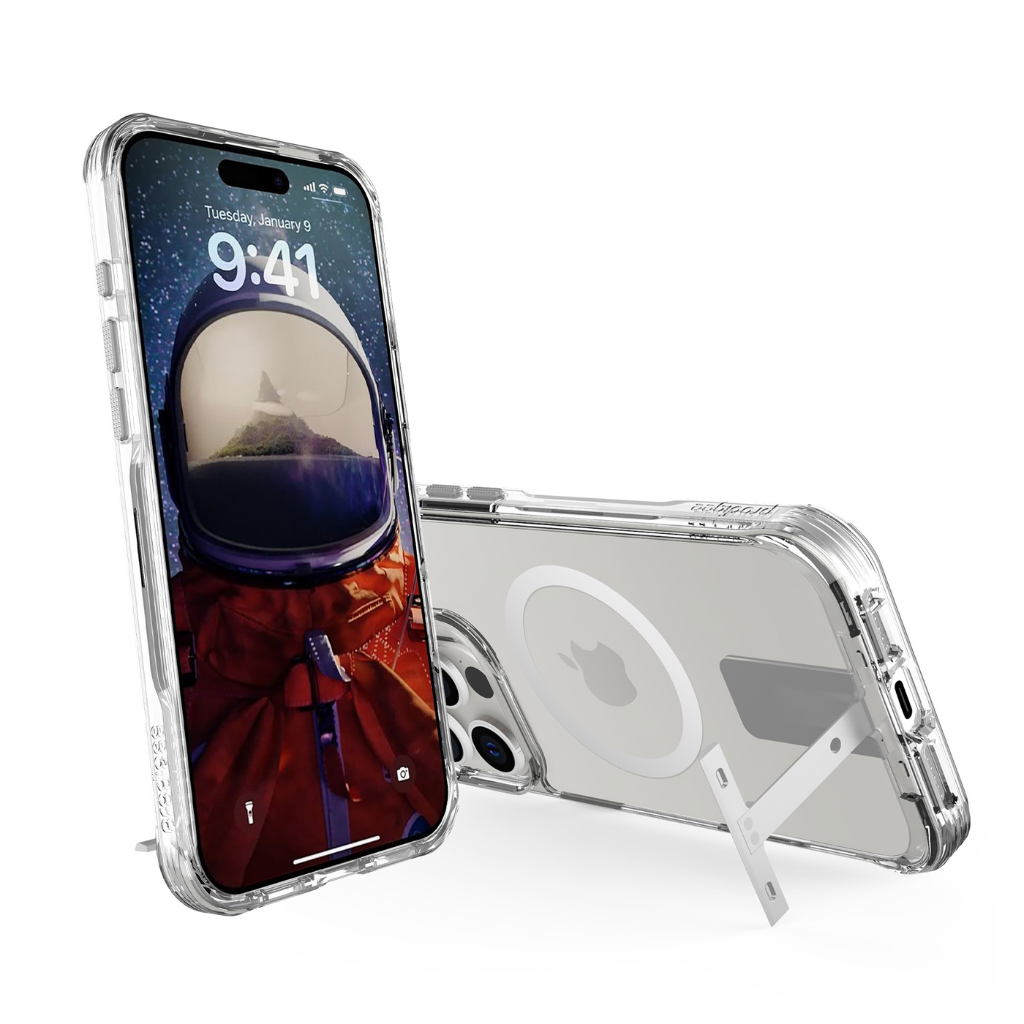Diseñado con un pie de apoyo colocado discretamente hecho de aleación de aluminio de alta calidad que sostiene firmemente su teléfono en posición vertical o horizontal. Imanes incorporados discretamente diseñados para carga inalámbrica MagSafe. Esta funda resistente brinda protección total con parachoques que absorben los golpes. Los botones con detalles metálicos se suman al aspecto elegante general de esta funda.