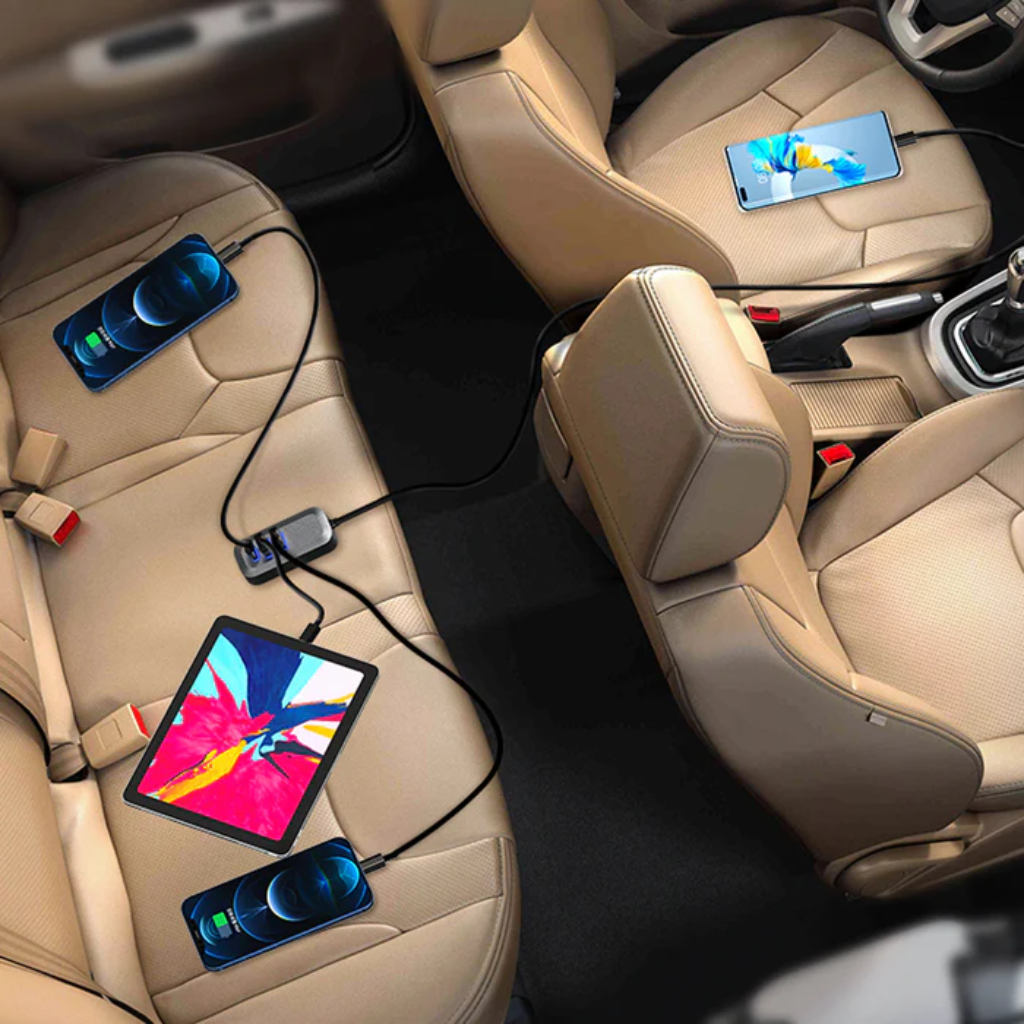 El Energee Wagon es un cargador de coche 4 en 1 ultra potente y versátil, diseñado para familias activas, conductores de viajes compartidos y quienes necesitan mantener múltiples dispositivos cargados al mismo tiempo. Con una potencia total de 100 W, incluye un puerto USB-C PD de 30 W para el asiento delantero y un módulo trasero con dos puertos USB QC 3.0 y otro USB-C PD de 30 W, conectados mediante un cable de 5 pies para máxima comodidad en la parte trasera. Su elegante diseño en aleación de aluminio, junto con el clip trasero organizador para cables, garantiza orden y estilo en cada trayecto. Equipado con tecnología de identificación inteligente, optimiza automáticamente la carga para cada dispositivo. Compatible con smartphones, tabletas, cámaras, consolas y más, el Energee Wagon se adapta a vehículos de 12 a 24 V, como autos, SUV, camiones y todoterrenos.