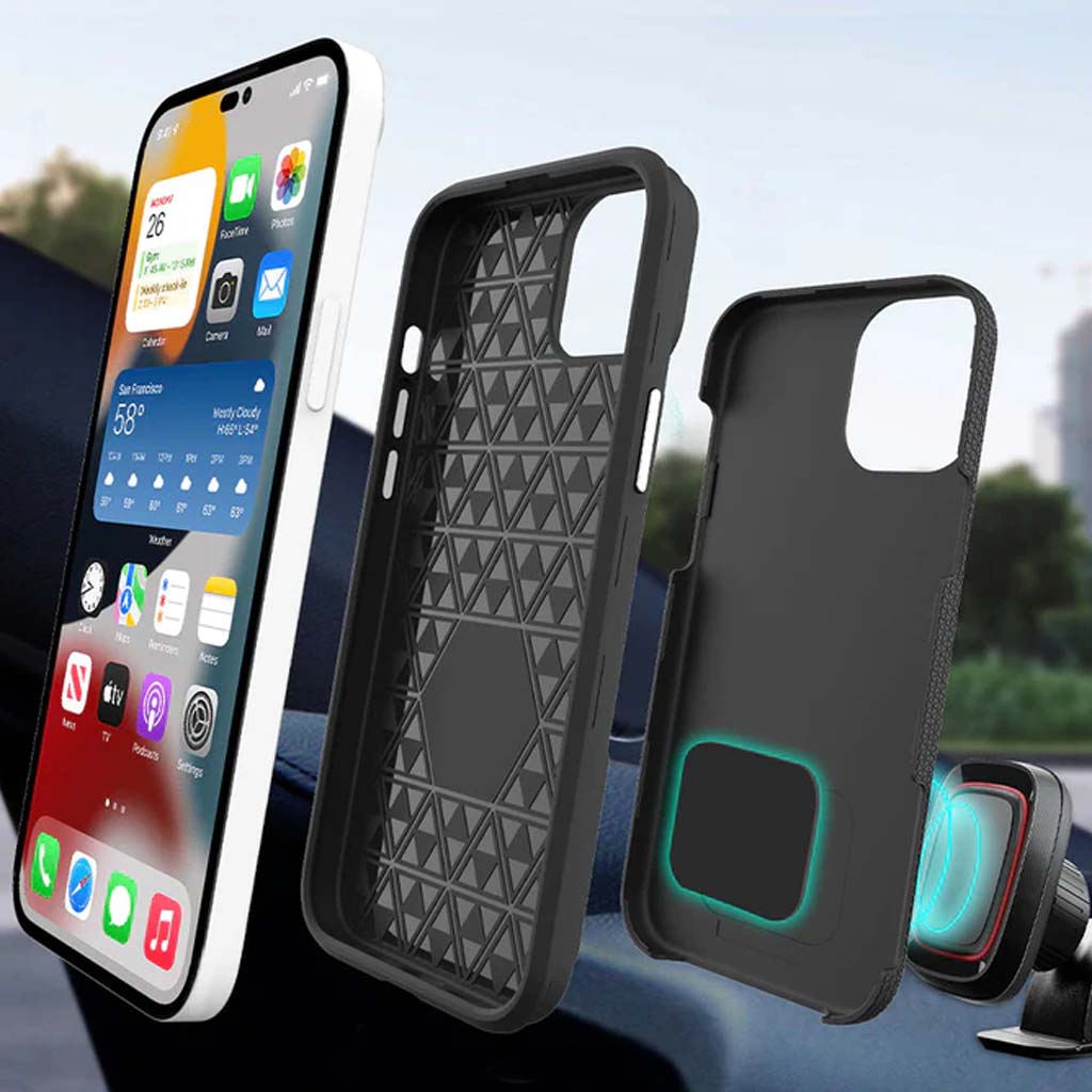 Nuestro estuche Rockee es compatible con manos libres, se incrustó una placa de metal en el diseño para que esté listo para nuestra serie de soportes para automóviles Magnet Pro+. Mantenga la carcasa de su teléfono limpia y ordenada, mientras que la ubicación única de las placas aún permite que su dispositivo se cargue de forma inalámbrica. La fusión de la construcción de material de 2 capas: capas interiores suaves y exteriores duras proporcionarán protección de grado militar. La primera capa trasera de policarbonato texturizado antiarañazos para un mejor agarre. El núcleo interior amortiguador de la segunda capa protege de golpes y caídas.