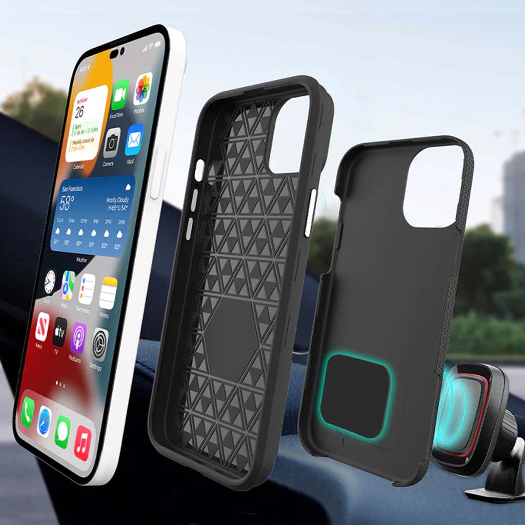 Nuestro estuche Rockee es compatible con manos libres, se incrustó una placa de metal en el diseño para que esté listo para nuestra serie de soportes para automóviles Magnet Pro+. Mantenga la carcasa de su teléfono limpia y ordenada, mientras que la ubicación única de las placas aún permite que su dispositivo se cargue de forma inalámbrica. La fusión de la construcción de material de 2 capas: capas interiores suaves y exteriores duras proporcionarán protección de grado militar. La primera capa trasera de policarbonato texturizado antiarañazos para un mejor agarre. El núcleo interior amortiguador de la segunda capa protege de golpes y caídas.