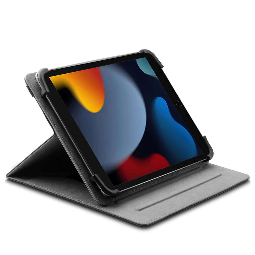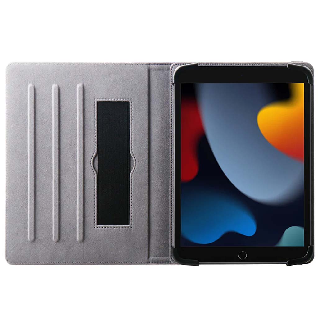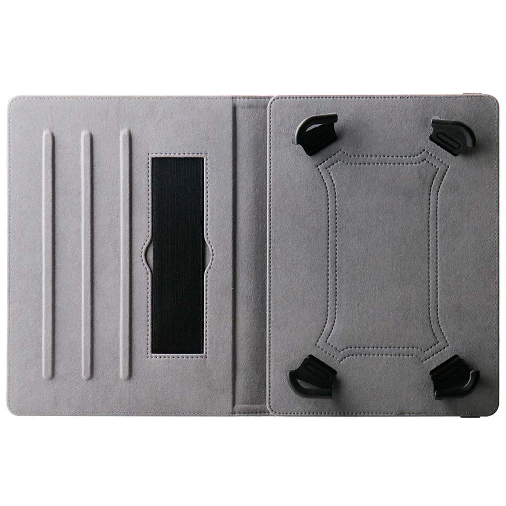 Este folio está diseñado para ser compatible con prácticamente todas las tabletas de 9-11". Diseñado con dos ranuras antideslizantes en el pliegue interior para permitirle configurar múltiples ángulos de soporte horizontales para obtener los mejores ángulos de visualización, ver películas o escribir. Los ganchos estilo bungy de tensión en las cuatro esquinas mantienen su tableta en su lugar de manera segura. Equipado con dos fuertes bandas elásticas. Uno para envolver la cubierta posterior y mantener la tableta cerrada de forma segura cuando no esté en uso. El segundo se coloca en el folio interior y se usa para ayudar a sostener su tableta con una mano. Fabricado con telas de microfibra suave de primera calidad para proteger su dispositivo contra rasguños, suciedad y mugre.