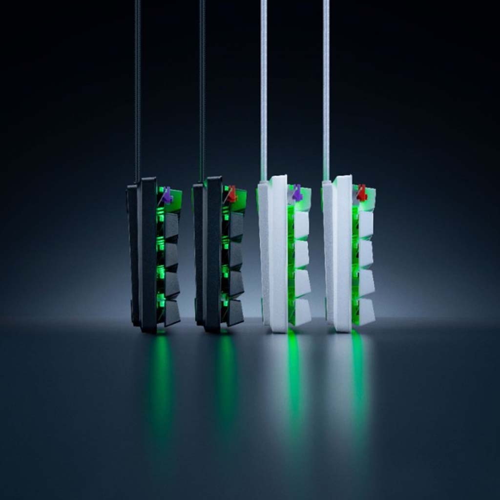 Interruptores ópticos Razer para actuación a la velocidad de la luz Ofrece actuaciones más rápidas, livianas y suaves que los interruptores mecánicos y dura más, ya que requiere menos piezas móviles que funcionan con menos fricción. Disponible en tres variantes: Lineal, Clicky y Analógico