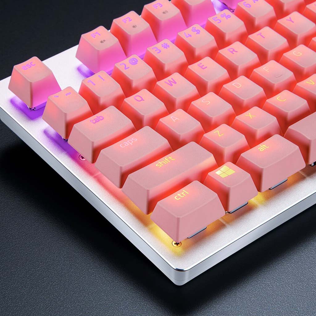 MATERIAL SUPERIOR PBT. Más duro y duradero que el ABS o el PVC, el PBT es un termoplástico de alta calidad que le da a las teclas un aspecto y una sensación de textura resistente que no se desgastará hasta dejar un acabado brillante. Diseñados con paredes extra gruesas, están bien equipados para manejar un uso extremo y producir pulsaciones de teclas más satisfactorias debido a su construcción sólida.