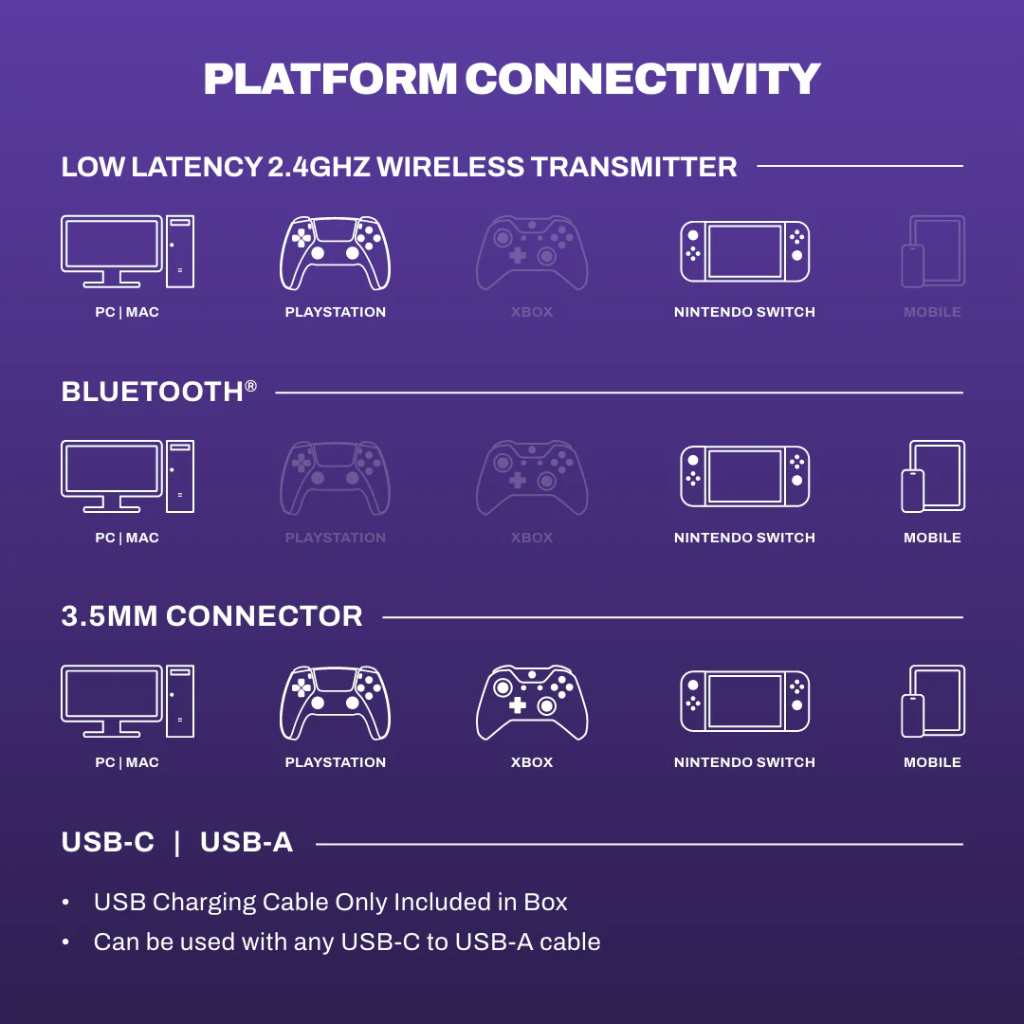 Transmisor inalámbrico de 2.4 GHz (incluido) - Los milisegundos importan. El transmisor inalámbrico de latencia ultra baja reduce drásticamente los retrasos de audio para los jugadores de PC y Playstation, hasta 20 milisegundos, y está diseñado específicamente para funcionar con los auriculares inalámbricos para juegos PLYR. Para Xbox, conecta el cable de 0.138 in incluido directamente en tu controlador.