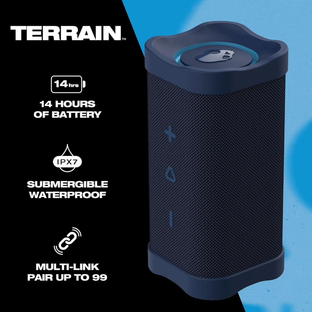 Muy ruidoso para cualquier multitud Con solo presionar un botón, Terrain Mini puede conectarse con hasta 99 altavoces Skullcandy para que pueda manejar cualquier tamaño de habitación y cualquier número de personas.