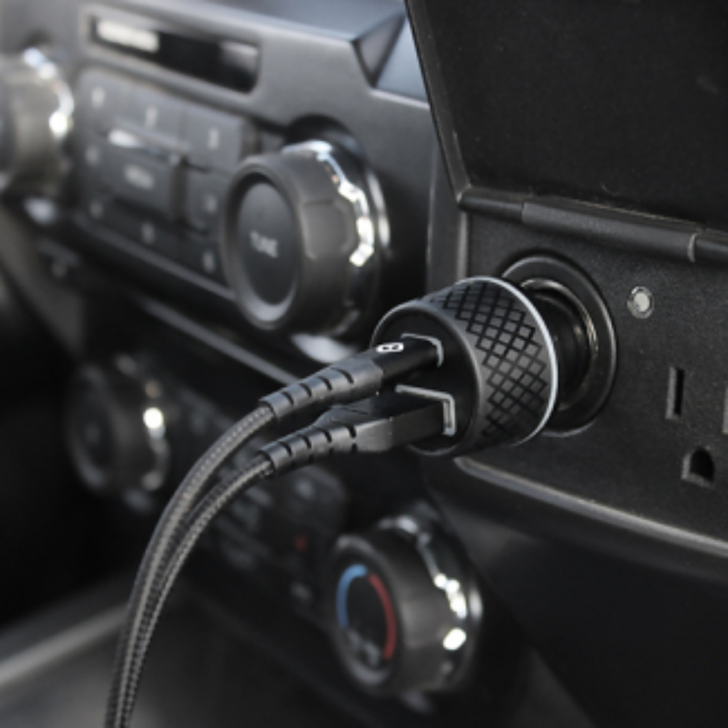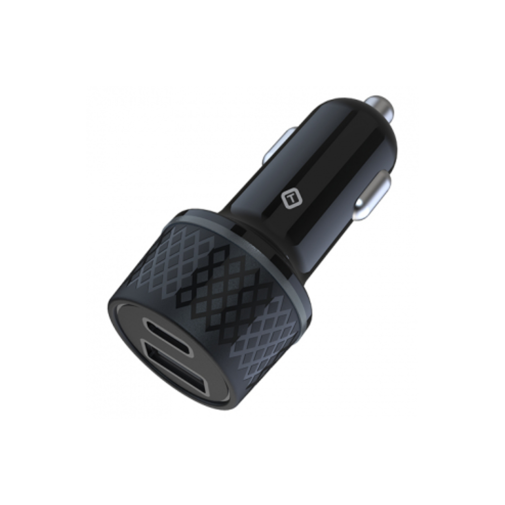 Cargador para automovil de doble puerto universal de 43 vatios con suministro de energia, cuenta con puerto USB-C de 25w y puerto USB-A 3.0 de 18w. La carga rapida con tecnologia Power Delivery carga hasta 4 veces mas rapido que los cargadores estandar.