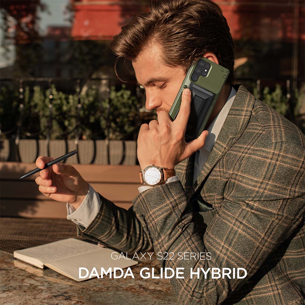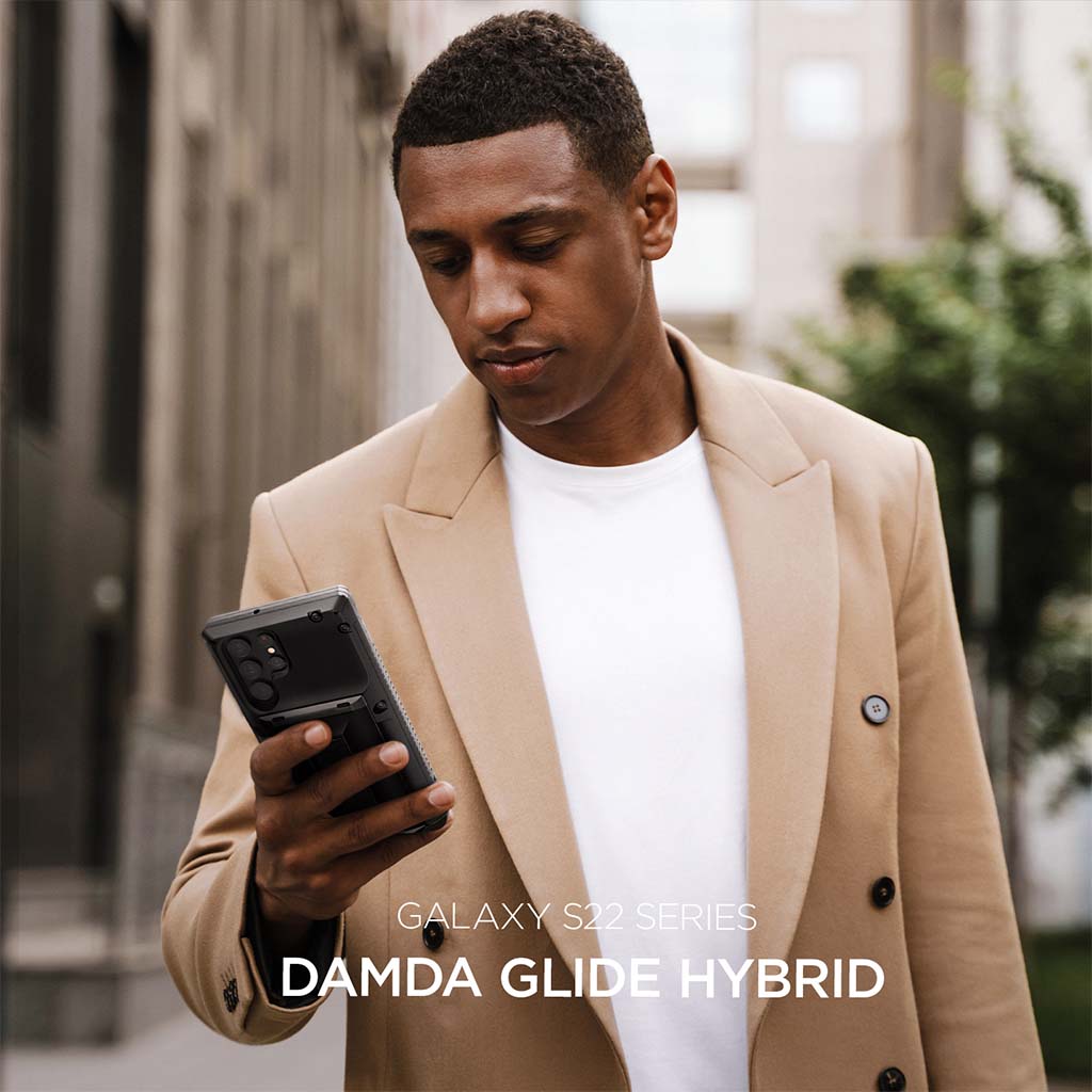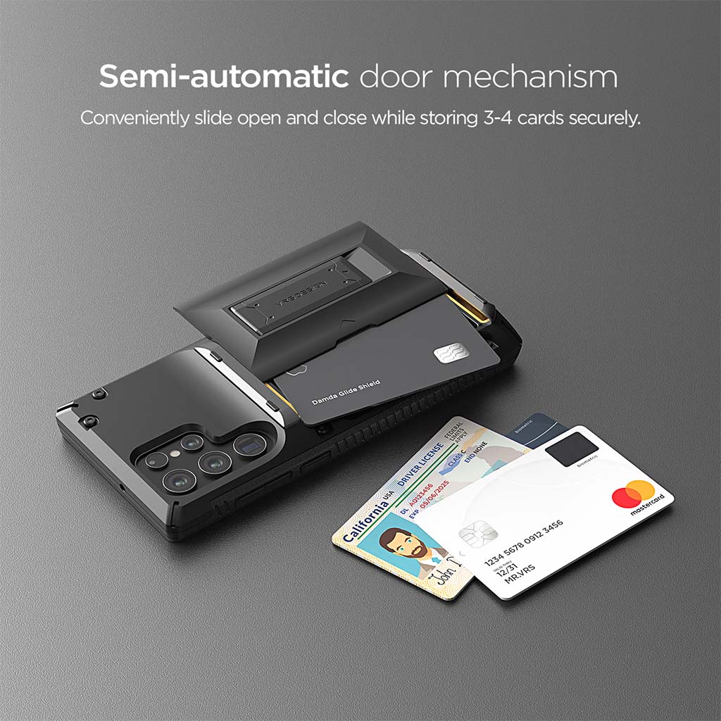El estuche VRS Design Damda Glide Hybrid para Samsung Galaxy S22 le permite acceder a sus tarjetas en un instante a través de un compartimento trasero deslizante semiautomático que puede contener de 3 a 4 tarjetas o efectivo. El exclusivo diseño híbrido cuenta con un pie de apoyo integrado que está diseñado ergonómicamente para sostener su teléfono de manera segura mientras ofrece múltiples posiciones de visualización para su entretenimiento favorito. El primer mecanismo deslizante semiautomático del mundo, le permite abrir el compartimento deslizante con un solo empujón. El mecanismo de bisagra con resorte responde inmediatamente con un empujón, lo que permite a los usuarios acceder a sus elementos esenciales sin dificultad. El compartimento para tarjetas con una ranura empotrada facilita el levantamiento de sus tarjetas cuando las necesita. El Damda Glide Hybrid es de doble capa que consta de un TPU flexible que absorbe los golpes y un marco de policarbonato que ofrece protección contra caídas. Estas capas resistentes a los impactos permiten a los usuarios viajar ligeros mientras protegen su dispositivo. Los bordes elevados protegen la pantalla y la cámara de arañazos cuando se colocan.