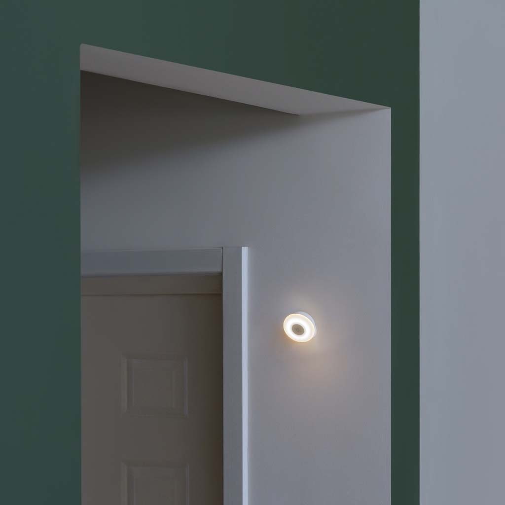 Diseño de montaje magnético rotación de 360° para escenarios de iluminación aún más accesibles La luz nocturna se puede colocar también en superficies planas, como las mesitas de noche. Para su montaje, se puede utilizar el adhesivo* de la base. Activa el brillo alto en armarios y entradas para una iluminación clara sin tener que encender la luz de la red principal. En las escaleras y los dormitorios, la luminosidad es baja para obtener una iluminación suave que no moleste. Retira la luz nocturna de la base para utilizarla por separado.